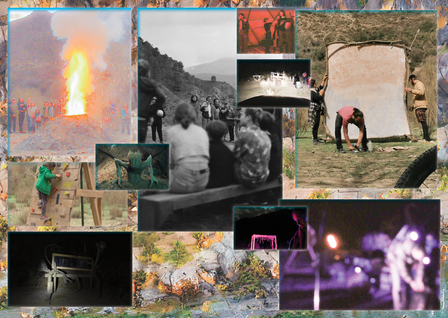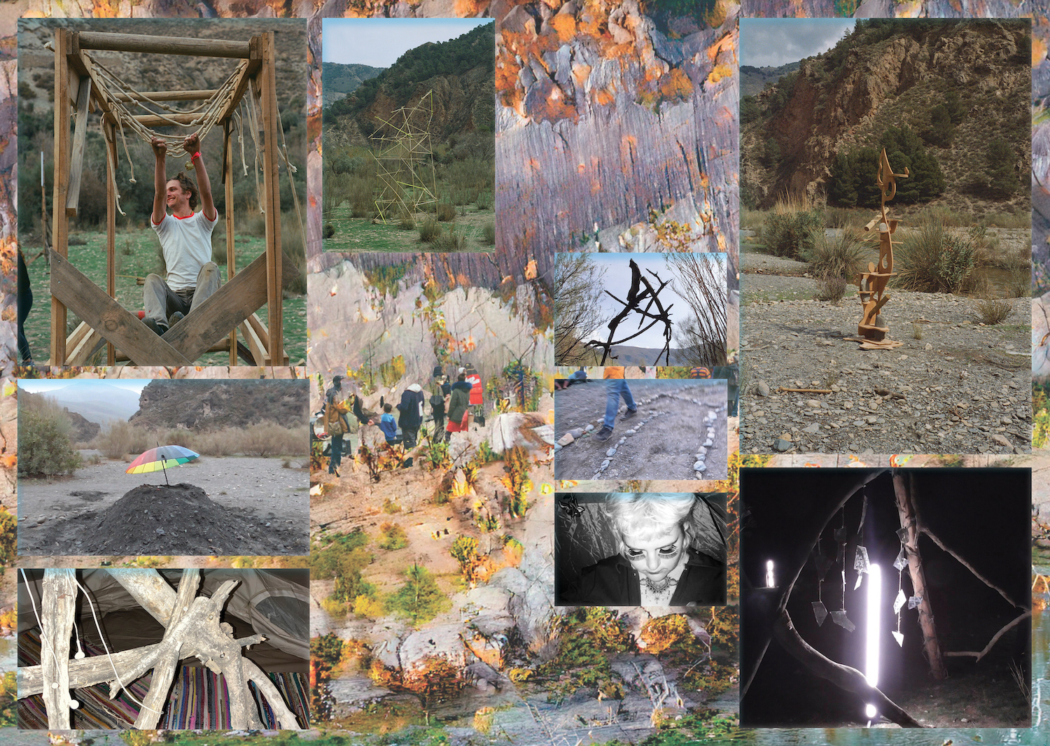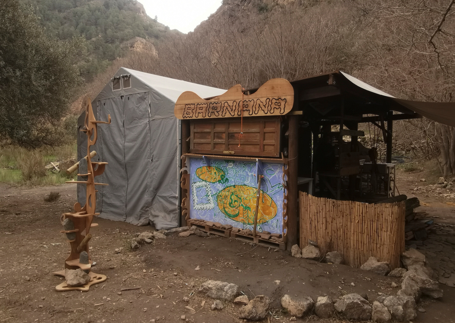 Dirty x Banana happened in February 2022 during one to six weeks. Near the river exploring rocks, collective possibilities and boundaries through community gathering, sudden season changes, workshops, cooking, theme nights, costume creation and a lot of caring/sharing. Between building our surrounding furnitures and utilities known as the best dry toilet with panorama view, hot shower in a spiral of cane, tents on slopes, kitchen where Mari would not sit but we hope applause. Rope, paths and a dome from the waterfall neighbors and games; we warmly want to welcome you to the crisálida of our journey.